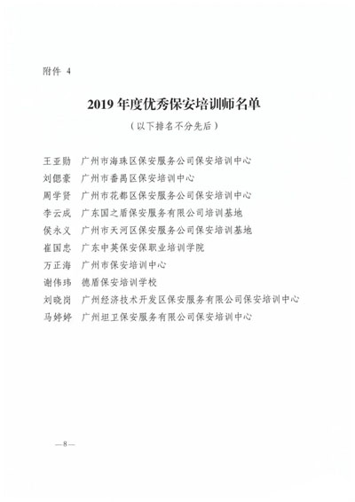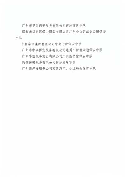 廣州市保安協(xié)會2019年度先進保安集體”榮譽稱號;授予廣州市保安服務(wù)總公司等10個單位“廣州市保安協(xié)會2019年度最具發(fā)展?jié)摿Ρ0卜?wù)企業(yè)”榮譽稱號;授予廣州市番禺區(qū)保安培訓(xùn)中心等3個單位“廣 州市保安協(xié)會2019年度優(yōu)秀保安培訓(xùn)單位”榮譽稱號;授予王亞勛等10名培訓(xùn)師“廣州市保安協(xié)會2019年度優(yōu)秀保安培訓(xùn)師”榮譽稱號(名單詳見下文)。